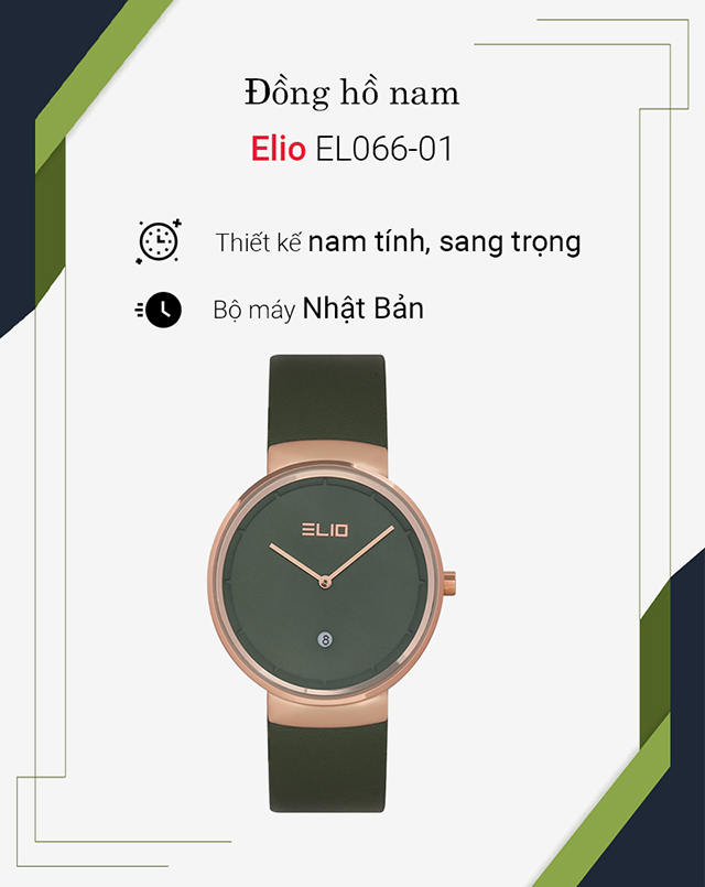 - Đồng hồ Elio với kiểu dáng, mẫu mã năng động, trẻ trung phù hợp với mọi lứa tuổi, đồng thời đồng hồ Elio còn mang vẻ đẹp sang trọng, lịch lãm. Đặc biệt đồng hồ Elio còn sử dụng bộ máy của Nhật Bản với chất lượng và độ bền cao.