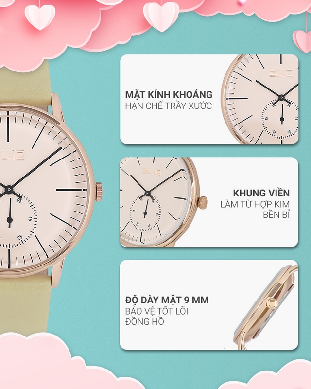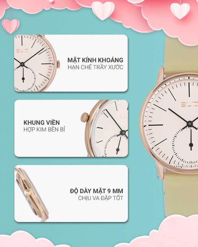 - Đồng hồ Elio với kiểu dáng, mẫu mã năng động, trẻ trung phù hợp với mọi lứa tuổi, đồng thời đồng hồ Elio còn mang vẻ đẹp sang trọng, lịch lãm. Đặc biệt đồng hồ Elio còn sử dụng bộ máy của Nhật Bản với chất lượng và độ bền cao.