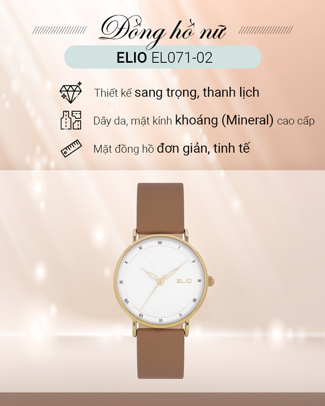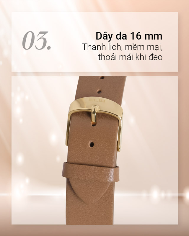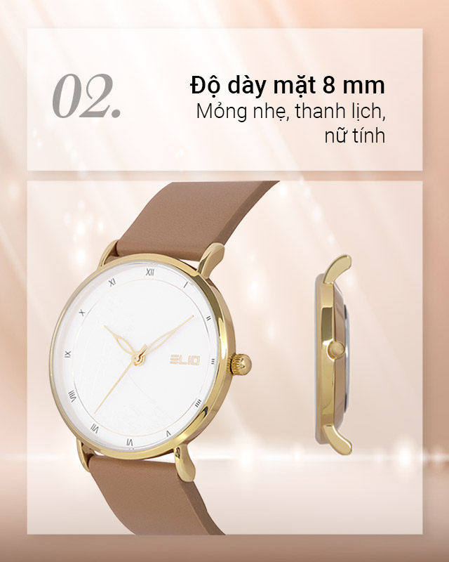 - Đồng hồ ELIO Nắng Xuân 32 mm Nữ EL071-02 có đường kính mặt 32 mm, độ rộng dây 16 mm.