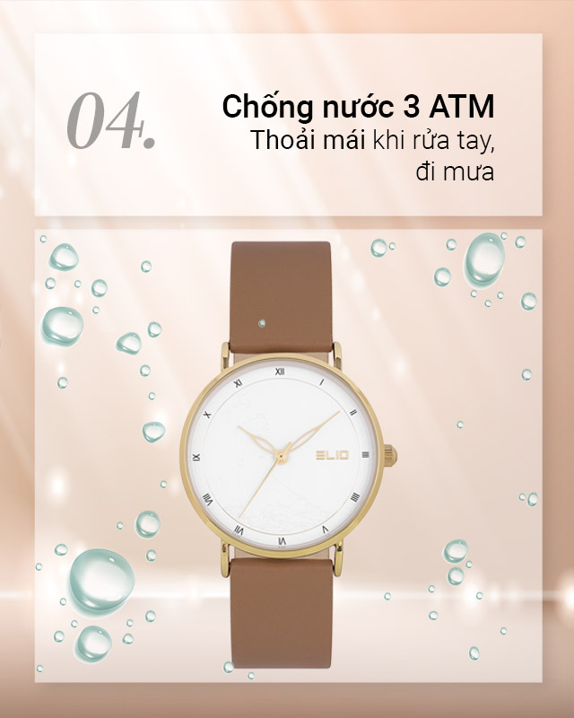 - Đồng hồ có hệ số chống nước 3 ATM: Thoải mái đeo khi đi mưa, rửa tay, không mang khi tắm, bơi hay lặn.