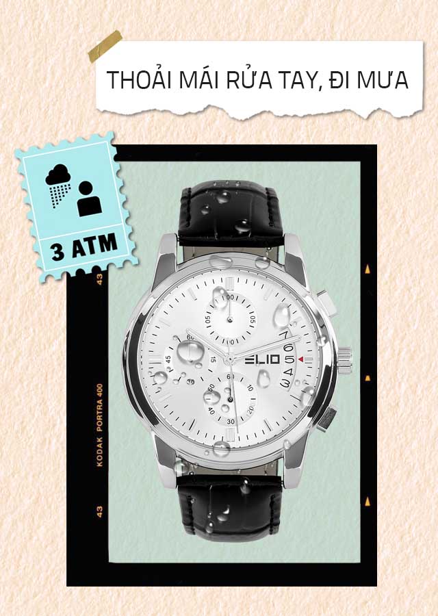 - Chống nước 3 ATM, không cần tháo đồng hồ ngay cả khi đi mưa nhỏ, rửa tay nhưng không nên đeo khi tắm, lặn hoặc bơi lội