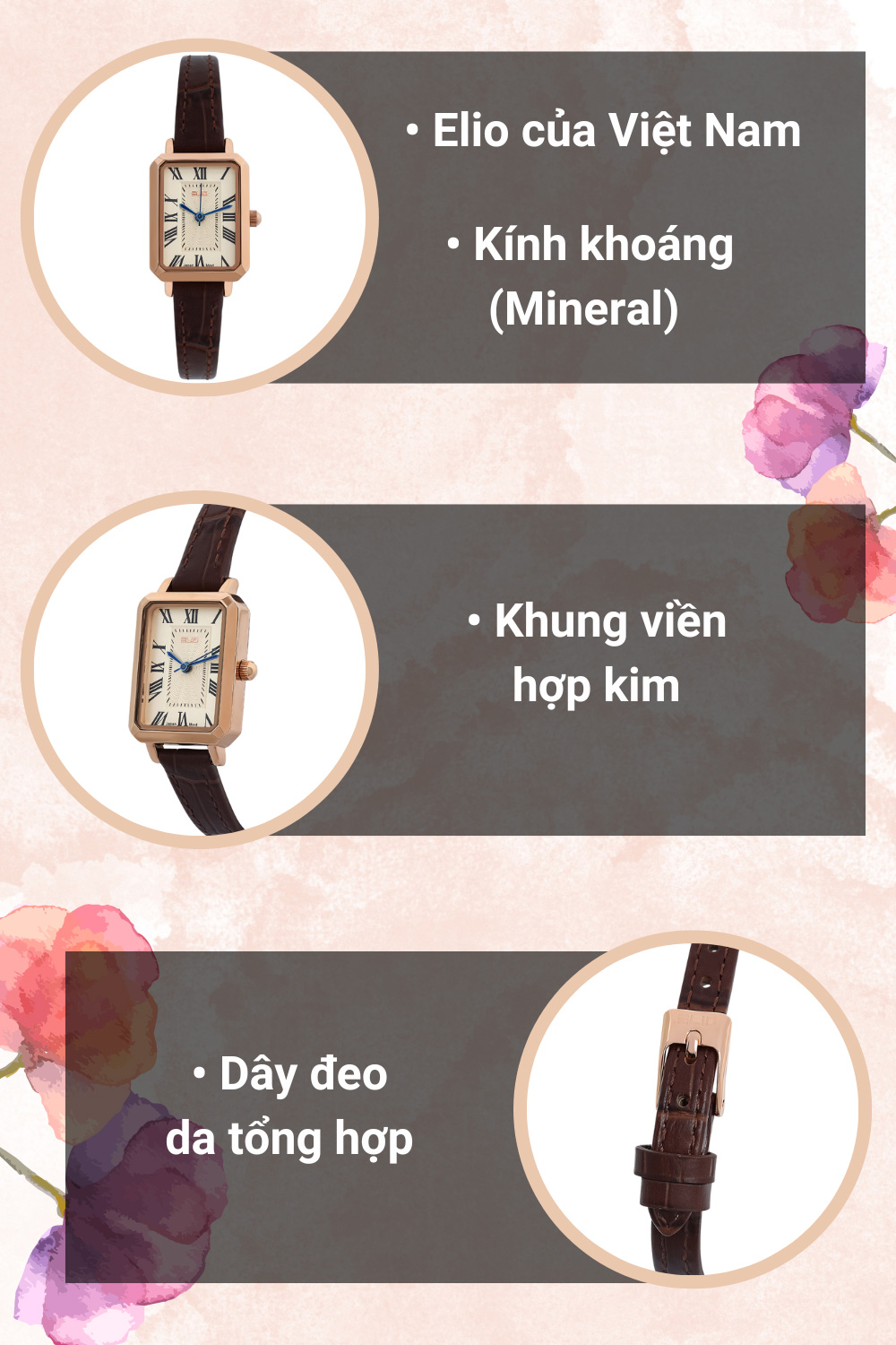 - Chiếc đồng hồ Elio này sở hữu đường kính mặt 21 mm, độ rộng dây 10 mm.