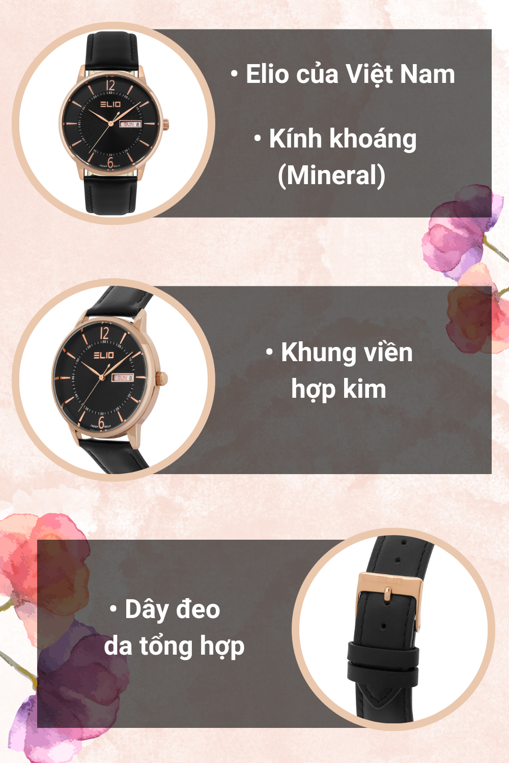 - Đồng hồ Elio với kiểu dáng, mẫu mã năng động, trẻ trung phù hợp với mọi lứa tuổi, đồng thời đồng hồ Elio còn mang vẻ đẹp sang trọng, lịch lãm. Đặc biệt đồng hồ Elio còn sử dụng bộ máy của Nhật Bản với chất lượng và độ bền cao.