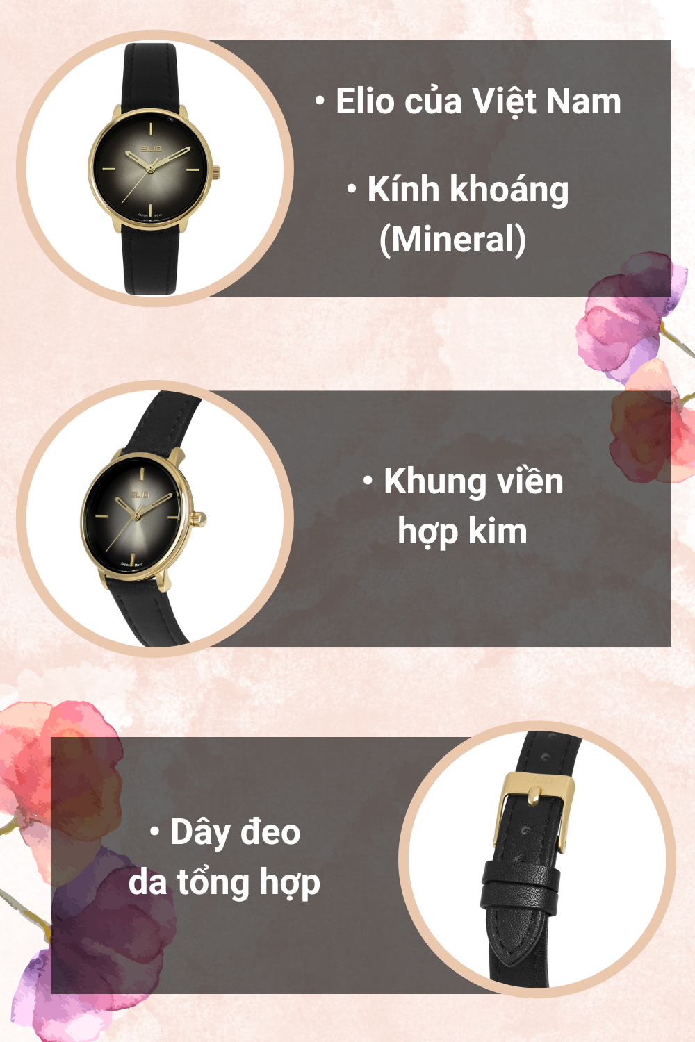 • Đồng hồ ELIO 30 mm Nữ EL117-02 có chất liệu dây da tổng hợp khiến người dùng cảm giác thoải mái khi sử dụng đồng hồ này. Khung viền được làm từ hợp kim sáng bóng, bền chắc, cứng cáp bảo vệ các chi tiết bên trong.