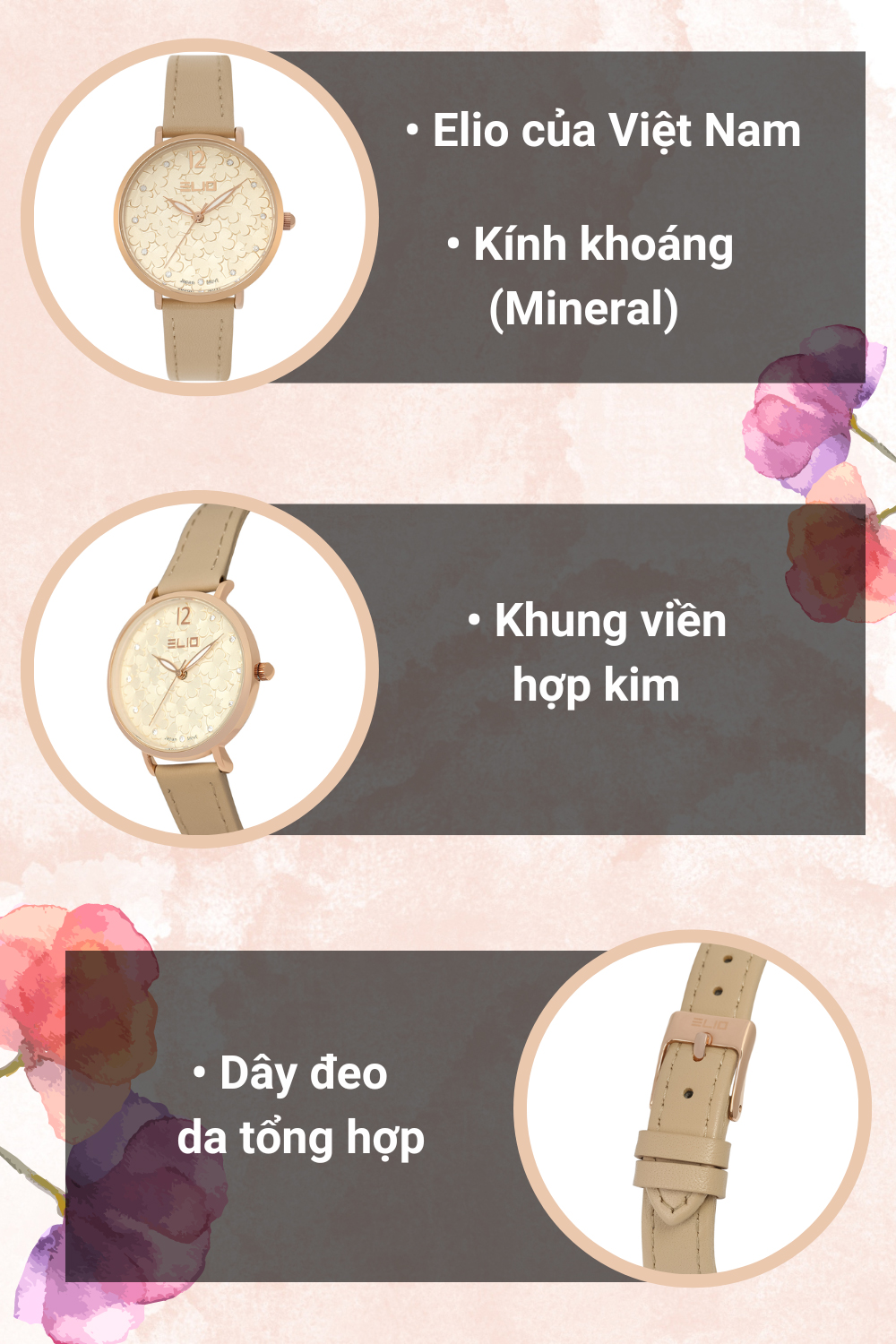 • Mẫu đồng hồ này phù hợp với những cô nàng ưa thích sự tinh tế và năng động. Mẫu đồng hồ này đến từ thương hiệu đồng hồ Elio - thương hiệu độc quyền của Thế Giới Di Động.