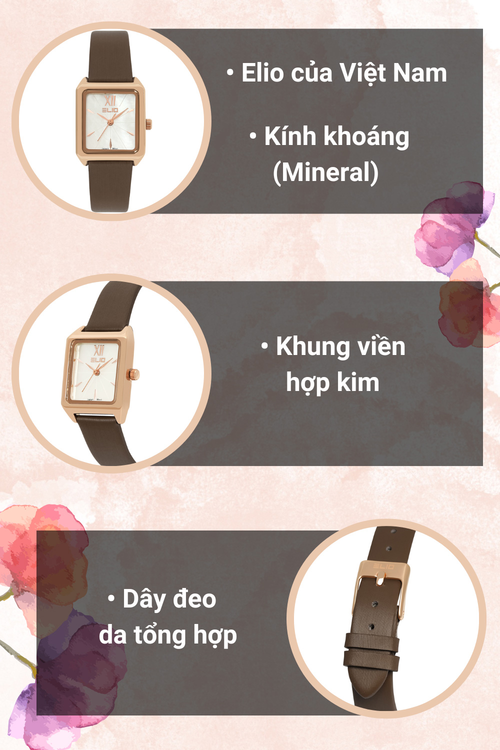 • Khung viền được làm từ hợp kim sáng bóng, bền chắc, cứng cáp bảo vệ các chi tiết bên trong. Đồng hồ ELIO 22 x 31 mm Nữ EL122-02 có chất liệu dây làm từ da tổng hợp khiến người dùng cảm giác thoải mái khi sử dụng đồng hồ này.