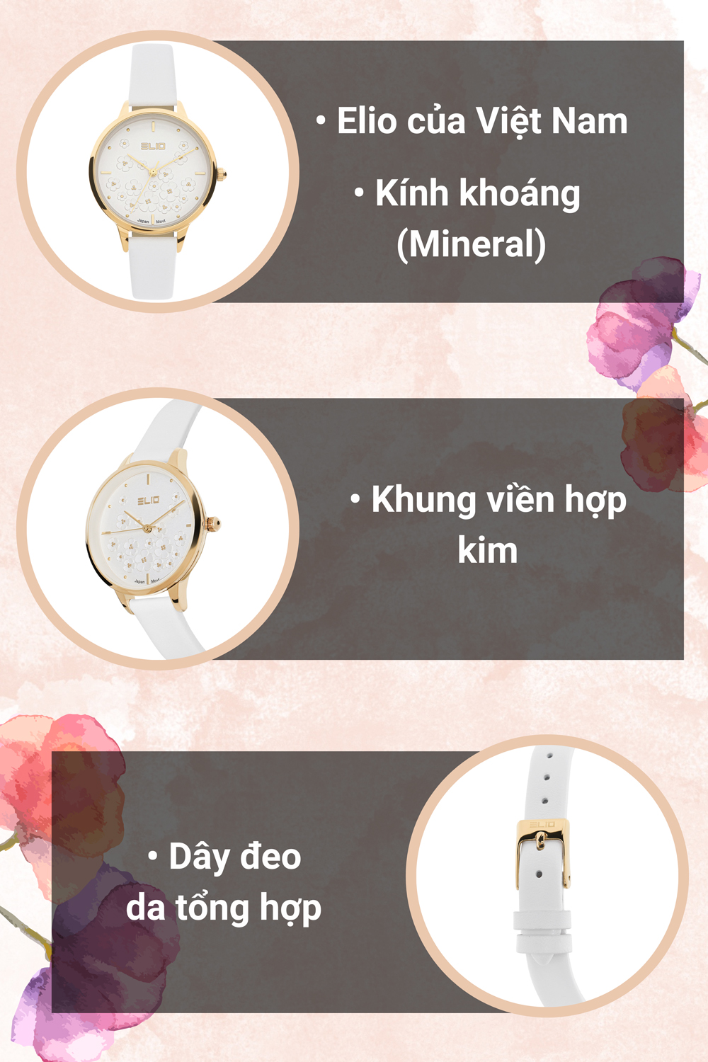 • Thương hiệu đồng hồ Elio hiện đang kinh doanh độc quyền tại Thế Giới Di Động có xuất xứ từ Việt Nam và nổi tiếng với mẫu mã và kiểu dáng ấn tượng, đặc biệt được các bạn trẻ yêu thích. Một trong số đó là mẫu đồng hồ Elio Flower 32 mm Nữ EL129-02 với thiết kế hoa làm chủ đạo.