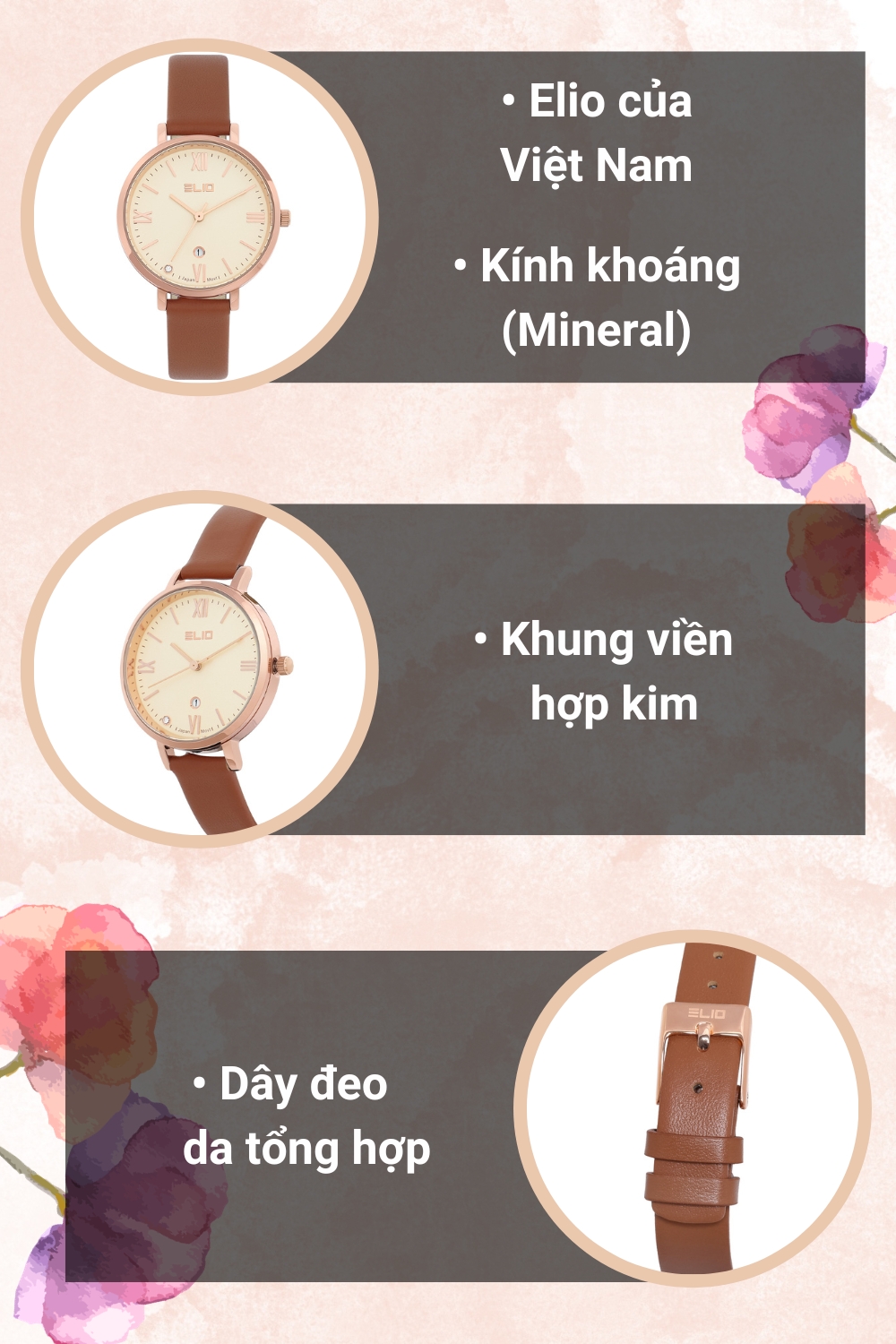 • Đồng hồ Elio là một thương hiệu đáng chú ý đến từ Việt Nam, với mong muốn đem đến cho người tiêu dùng yêu thích thời trang không chỉ những sản phẩm đẹp mà còn chất lượng, hãng đã luôn chú trọng và đặt tâm huyết của mình vào từng mẫu mã, thiết kế. Nếu bạn đang muốn tìm cho mình một chiếc đồng hồ với thiết kế sang trọng, có thể kết hợp với đa dạng phong cách thì Elio là thương hiệu bạn nên cân nhắc.