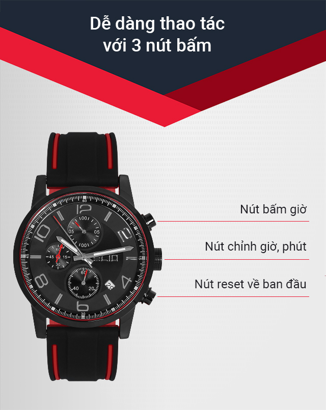 - Ngoài ra, mẫu đồng hồ nam này còn hỗ trợ thêm tiện ích bấm giờ thể thao hay còn gọi là bấm giờ (Chronograph) và lịch ngày