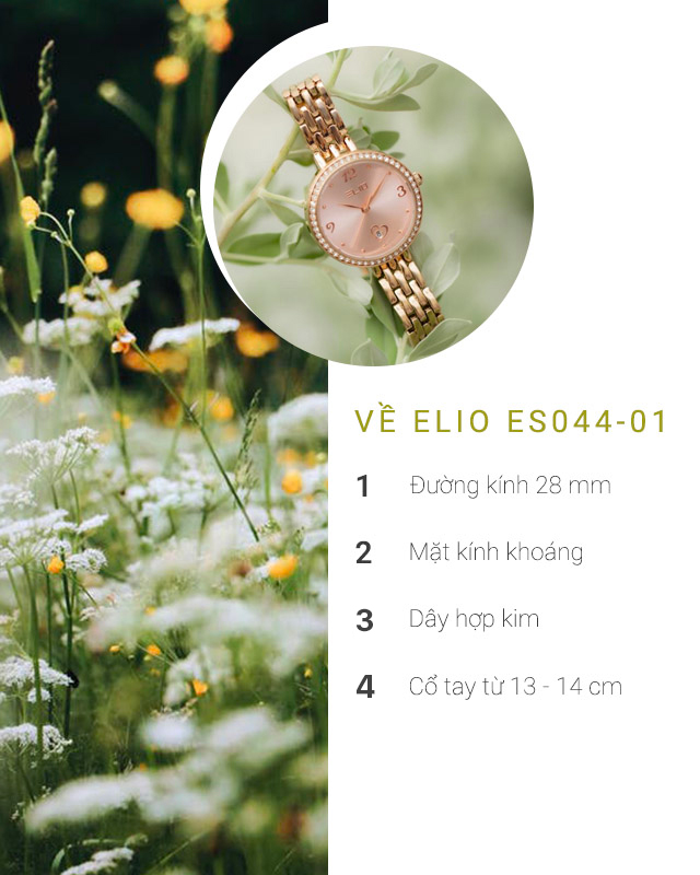 Đồng hồ Nữ Elio ES044-01 đến từ bộ sưu tập Nàng ThơĐồng hồ Nữ Elio ES044-01 đơn giản, nữ tínhĐồng hồ Nữ Elio ES044-01 - Tổng quanĐồng hồ Nữ Elio ES044-01 có đường kính mặt 28 mmĐồng hồ Nữ Elio ES044-01 có hệ số chống nước 3 ATMĐồng hồ Nữ Elio ES044-01 có dây đeo hợp kim bền bỉ
