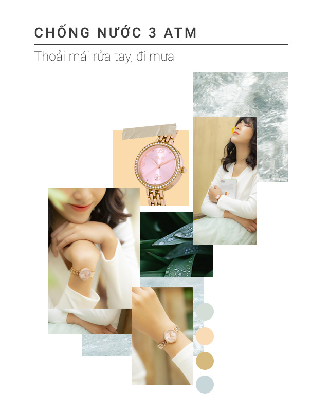 - Độ chống nước 3 ATM cho phép bạn đeo đồng hồ đi mưa, rửa tay, không mang khi tắm hay bơi lội