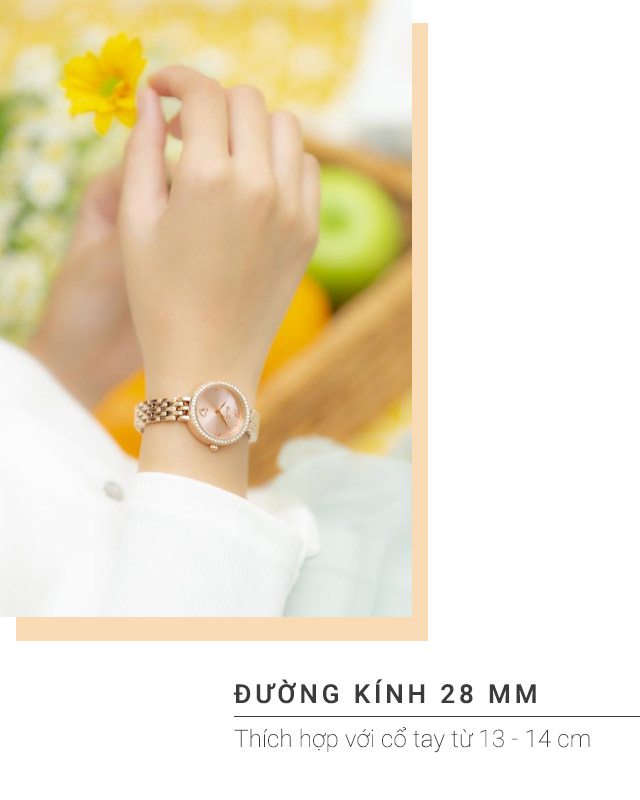 - Mẫu đồng hồ nữ này đường kính mặt 28 mm, độ rộng dây 10 mm