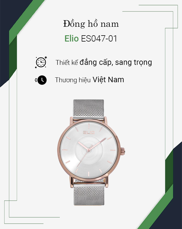 - Đồng hồ Elio với kiểu dáng, mẫu mã năng động, trẻ trung phù hợp với mọi lứa tuổi, đồng thời đồng hồ Elio còn mang vẻ đẹp sang trọng, lịch lãm. Đặc biệt đồng hồ Elio còn sử dụng bộ máy của Nhật Bản với chất lượng và độ bền cao.