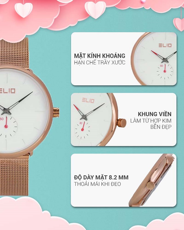 - Đồng hồ Elio với kiểu dáng, mẫu mã năng động, trẻ trung phù hợp với mọi lứa tuổi, đồng thời đồng hồ Elio còn mang vẻ đẹp sang trọng, lịch lãm. Đặc biệt đồng hồ Elio còn sử dụng bộ máy của Nhật Bản với chất lượng và độ bền cao.