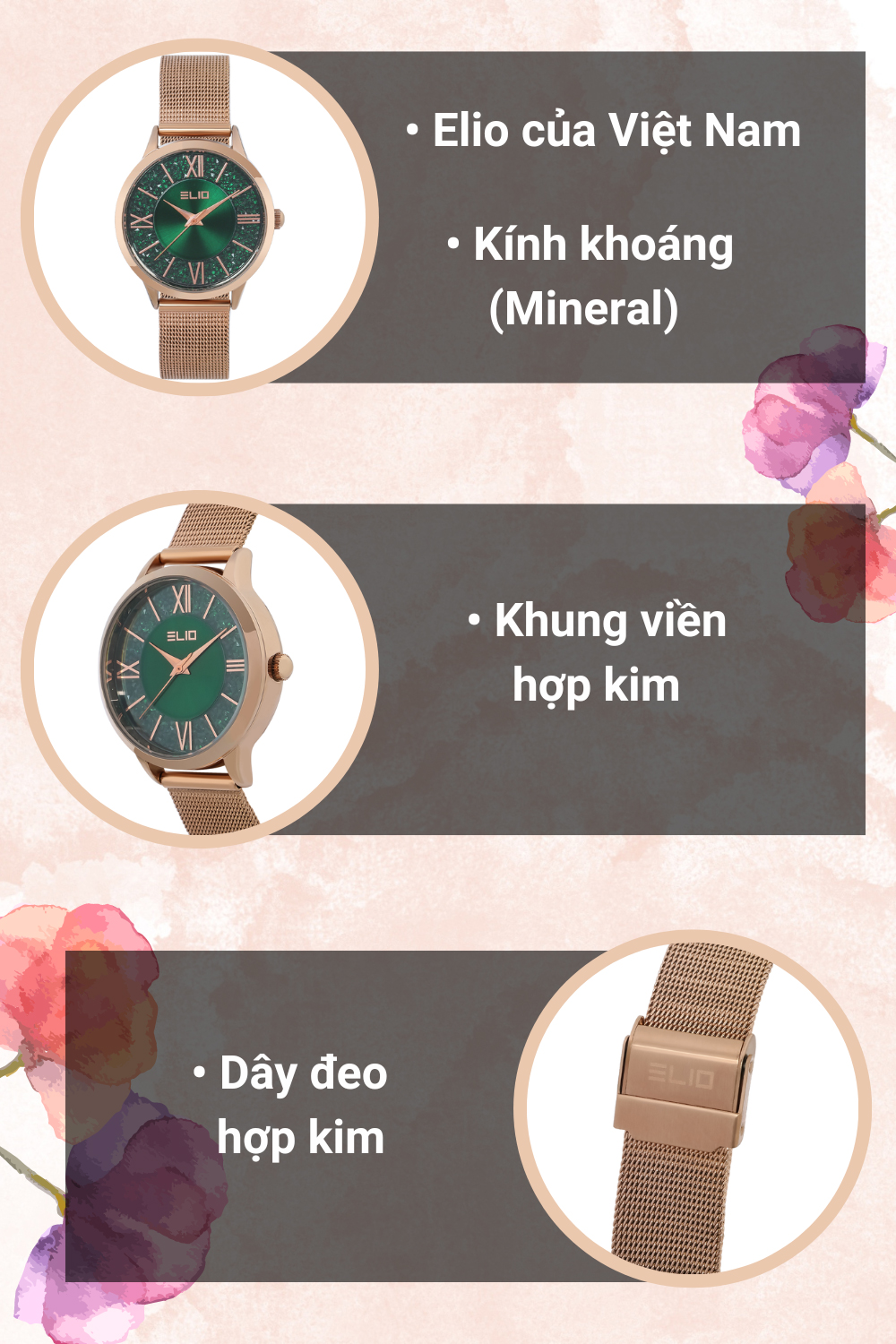 - Đồng hồ Elio với kiểu dáng, mẫu mã năng động, trẻ trung phù hợp với mọi lứa tuổi, đồng thời đồng hồ Elio còn mang vẻ đẹp sang trọng, lịch lãm. Đặc biệt đồng hồ Elio còn sử dụng bộ máy của Nhật Bản với chất lượng và độ bền cao.