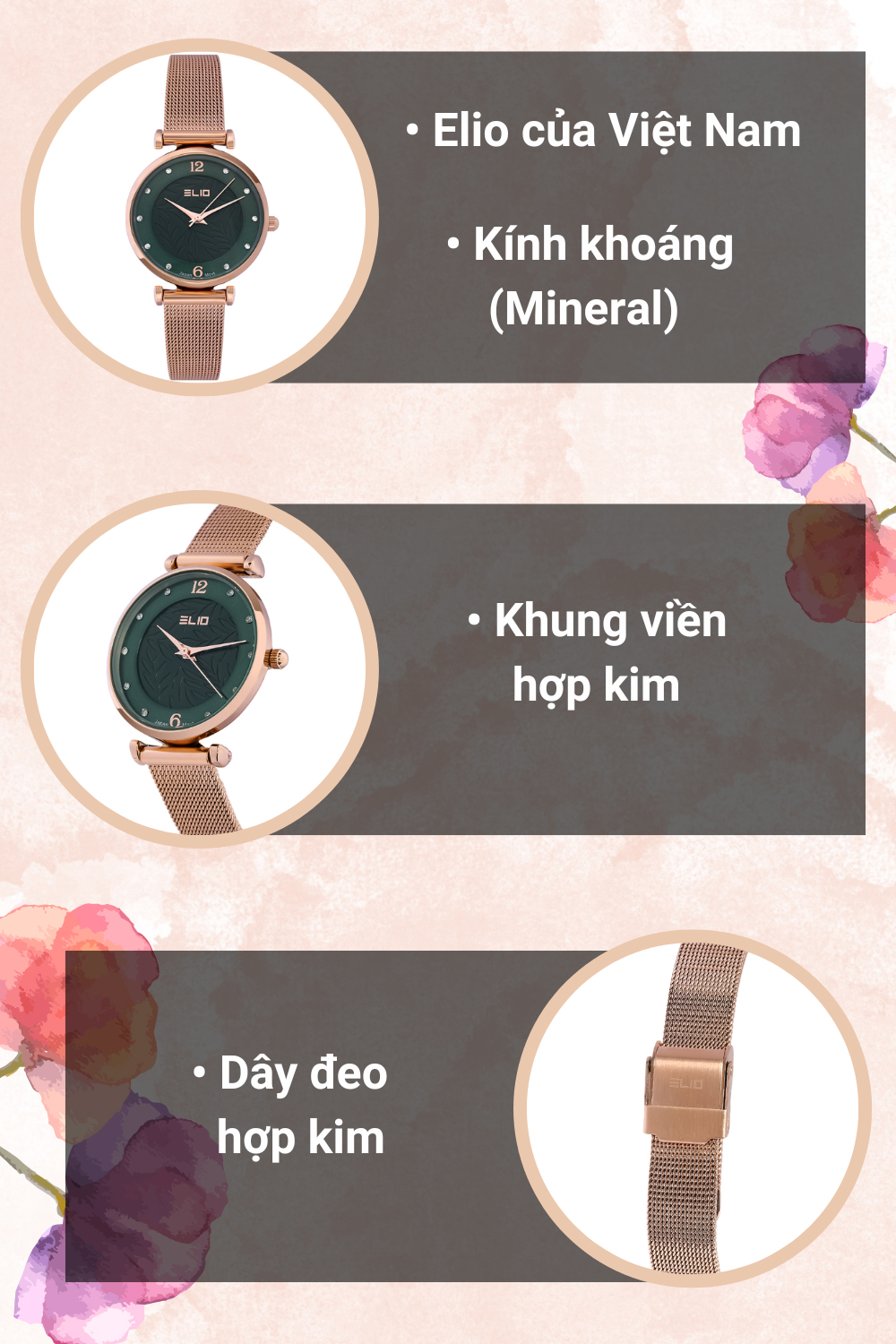 - Đồng hồ Elio với kiểu dáng, mẫu mã năng động, trẻ trung phù hợp với mọi lứa tuổi, đồng thời đồng hồ Elio còn mang vẻ đẹp sang trọng, lịch lãm. Đặc biệt đồng hồ Elio còn sử dụng bộ máy của Nhật Bản với chất lượng và độ bền cao.