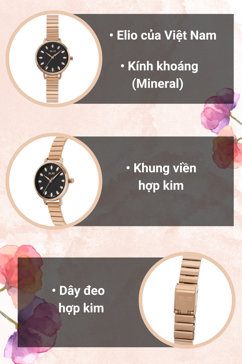 • Đồng hồ ELIO Flower 28 mm Nữ ES111-01 có đường kính mặt 28 mm, độ rộng dây 10 mm.