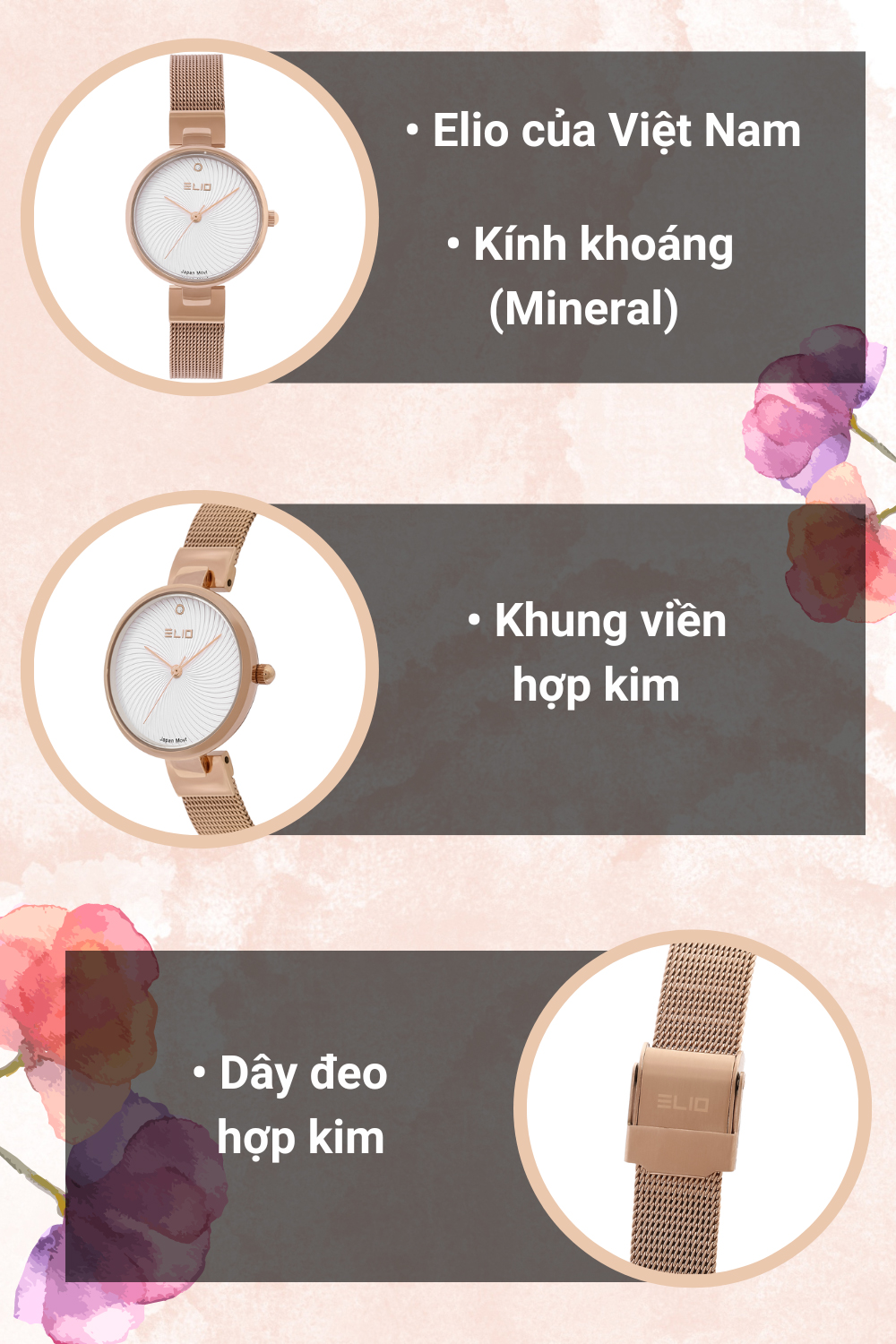 • Khung viền đồng hồ vô cùng chắc chắn được làm từ chất liệu hợp kim cứng cáp, có khả năng chịu lực tốt giúp duy trì độ bền bỉ lâu dài theo thời gian. Đồng hồ ELIO 30 mm Nữ ES115-01 thuộc BST Nàng thơ có dây đeo với chất liệu hợp kim có khả năng chịu lực tốt, bền bỉ trong mọi điều kiện thời tiết, luôn giữ được vẻ sáng bóng và có thể dễ dàng vệ sinh khi bám bụi bẩn.