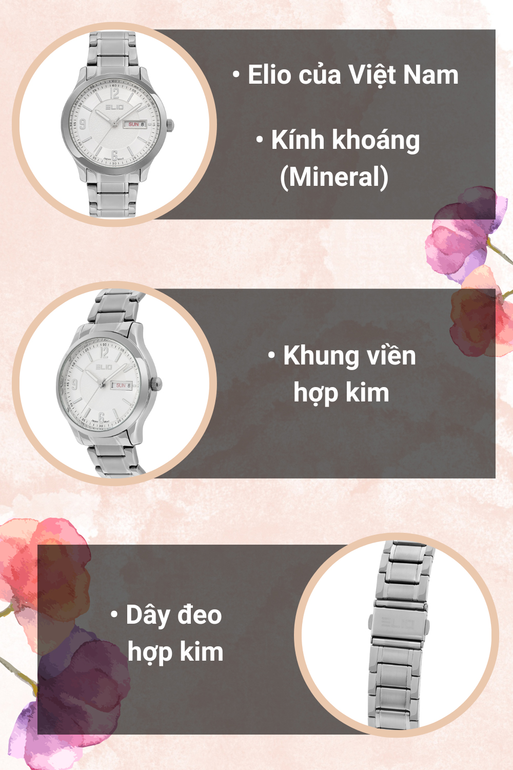 - Đồng hồ Elio với kiểu dáng, mẫu mã năng động, trẻ trung phù hợp với mọi lứa tuổi, đồng thời đồng hồ Elio còn mang vẻ đẹp sang trọng, lịch lãm. Đặc biệt đồng hồ Elio còn sử dụng bộ máy của Nhật Bản với chất lượng và độ bền cao.
