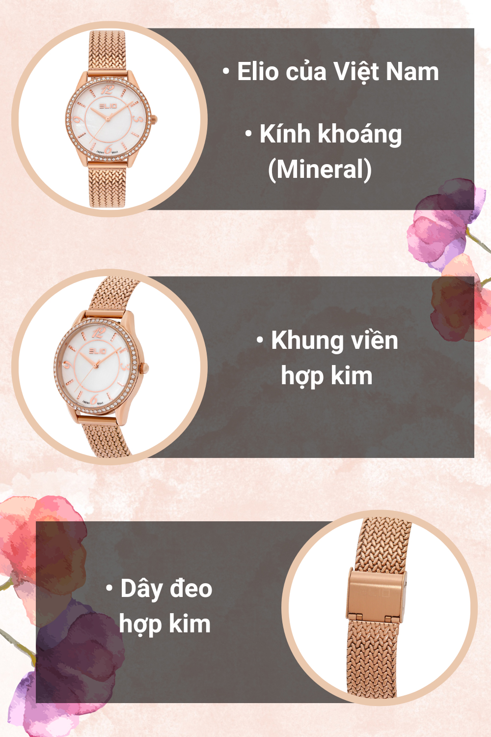 • Đồng hồ có thiết kế ánh vàng hồng quyến rũ và lấp lánh, bề mặt với thiết kế đầy tinh tế sẽ thu hút ánh nhìn của nhiều người. Đây là sản phẩm đến từ hãng đồng hồ Elio chất lượng của Việt Nam - được kinh doanh độc quyền tại Thế Giới Di Động.