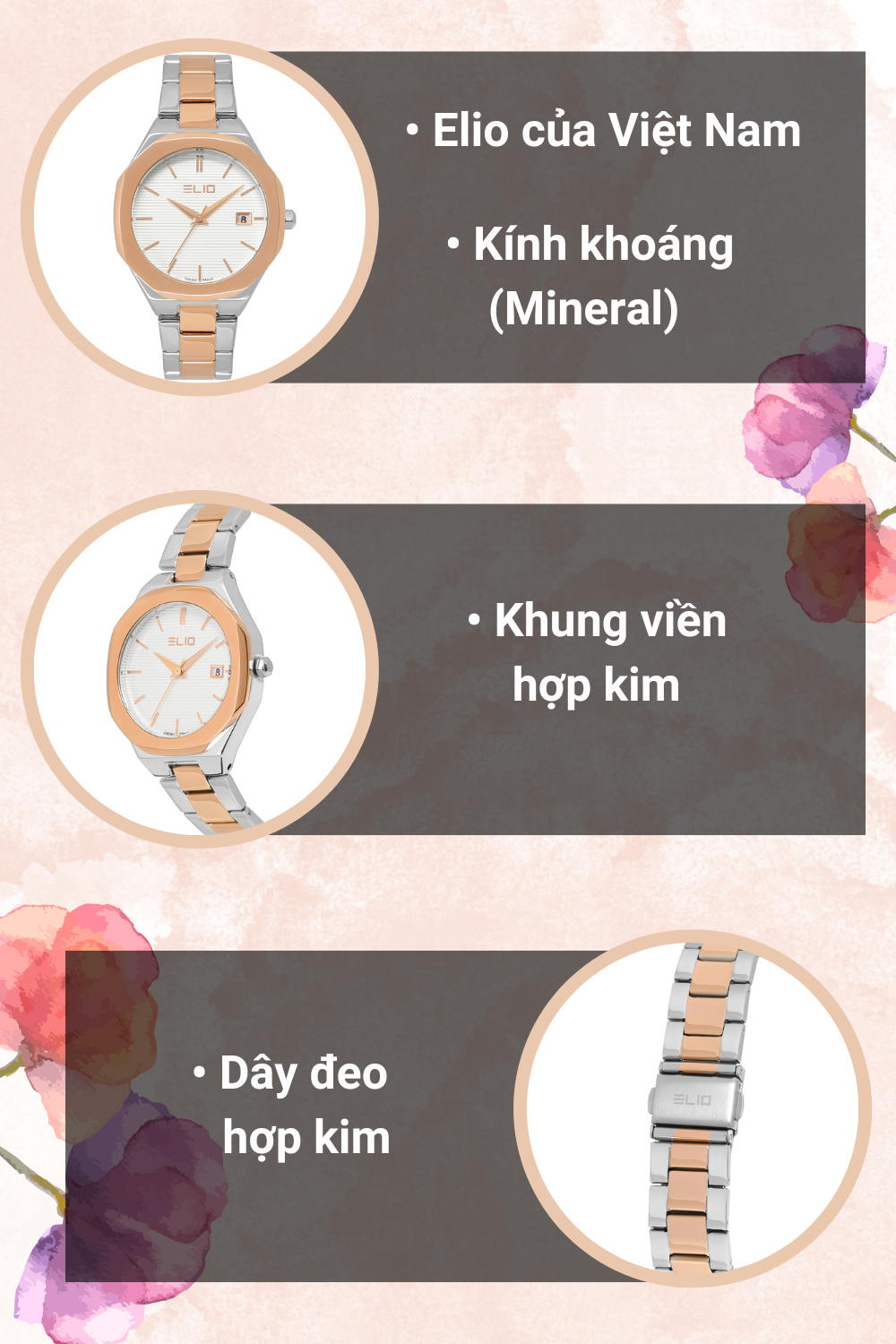 • Mẫu đồng hồ này phù hợp với những cô nàng ưa thích sự tinh tế và năng động. Mẫu đồng hồ này đến từ thương hiệu đồng hồ Elio - thương hiệu độc quyền của Thế Giới Di Động.