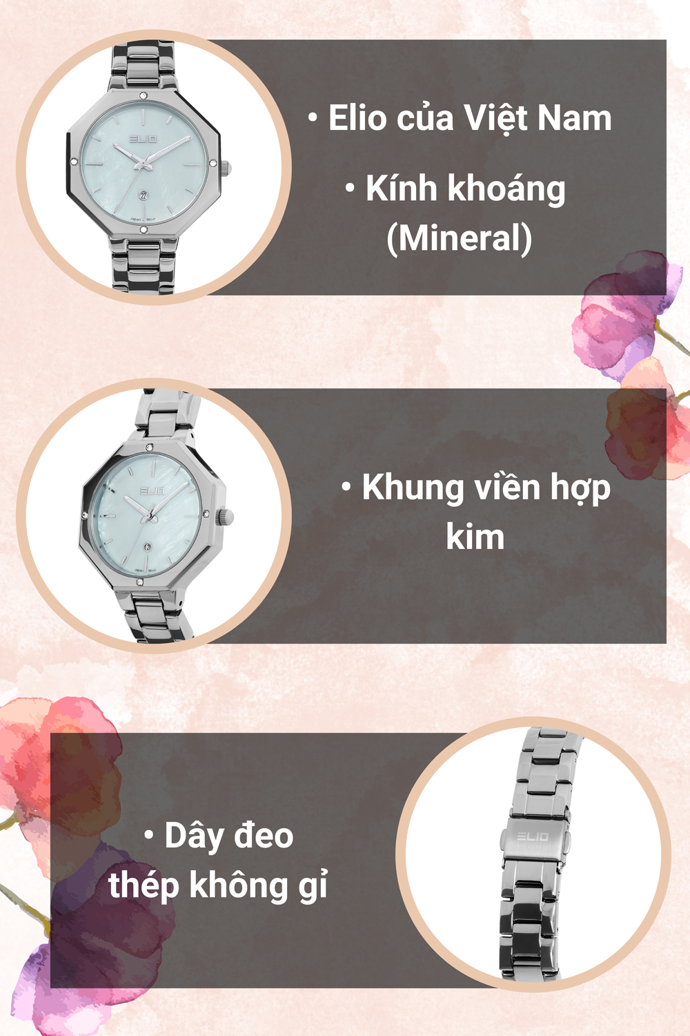 • Elio sử dụng chất liệu kính khoáng cho phần mặt kính, có thể chịu được trầy xước ở mức vừa phải và độ trong suốt cao giúp bạn quan sát giờ một cách dễ dàng. Đồng thời, thiết kế có kích thước mặt là 33.5 mm phù hợp với các quý cô kích thước cổ tay lớn.