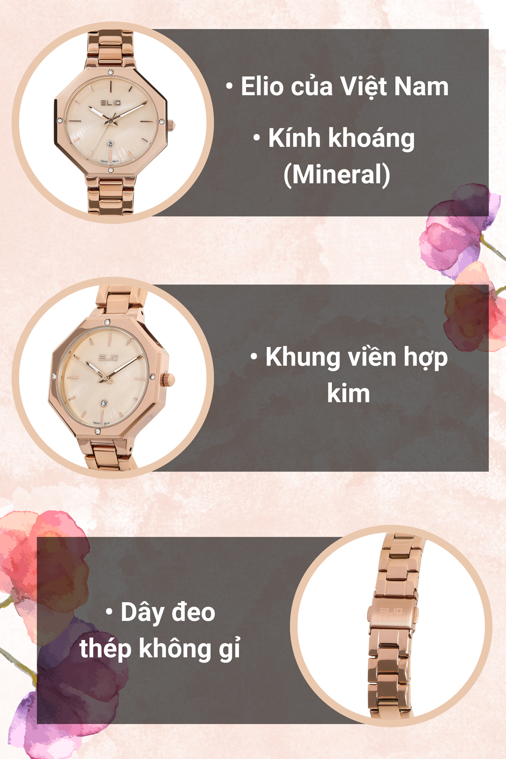 • Đồng hồ Elio hệ số kháng nước 3 ATM, các bạn nữ lưu ý không đeo khi đi tắm, đi bơi hay đi lặn nhưng vẫn có thể chịu nước khi tiếp xúc với không khí ẩm thường ngày, khi rửa tay hoặc các “rủi ro” bất ngờ như mưa lâm râm.