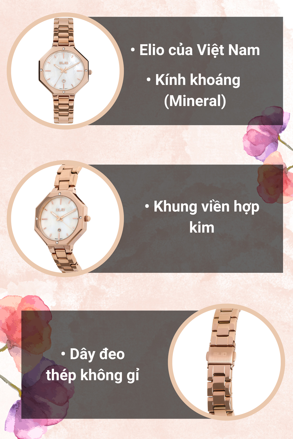 • Đồng hồ này có kích thước mặt là 33.5 mm phù hợp với các quý cô kích thước cổ tay vừa. Elio sử dụng chất liệu kính khoáng cho phần mặt kính, có thể chịu được trầy xước ở mức vừa phải, ít nứt vỡ khi bị va đập trong khi vẫn có độ trong suốt phù hợp người đeo có thể thấy rõ mọi chi tiết trên mặt đồng hồ.