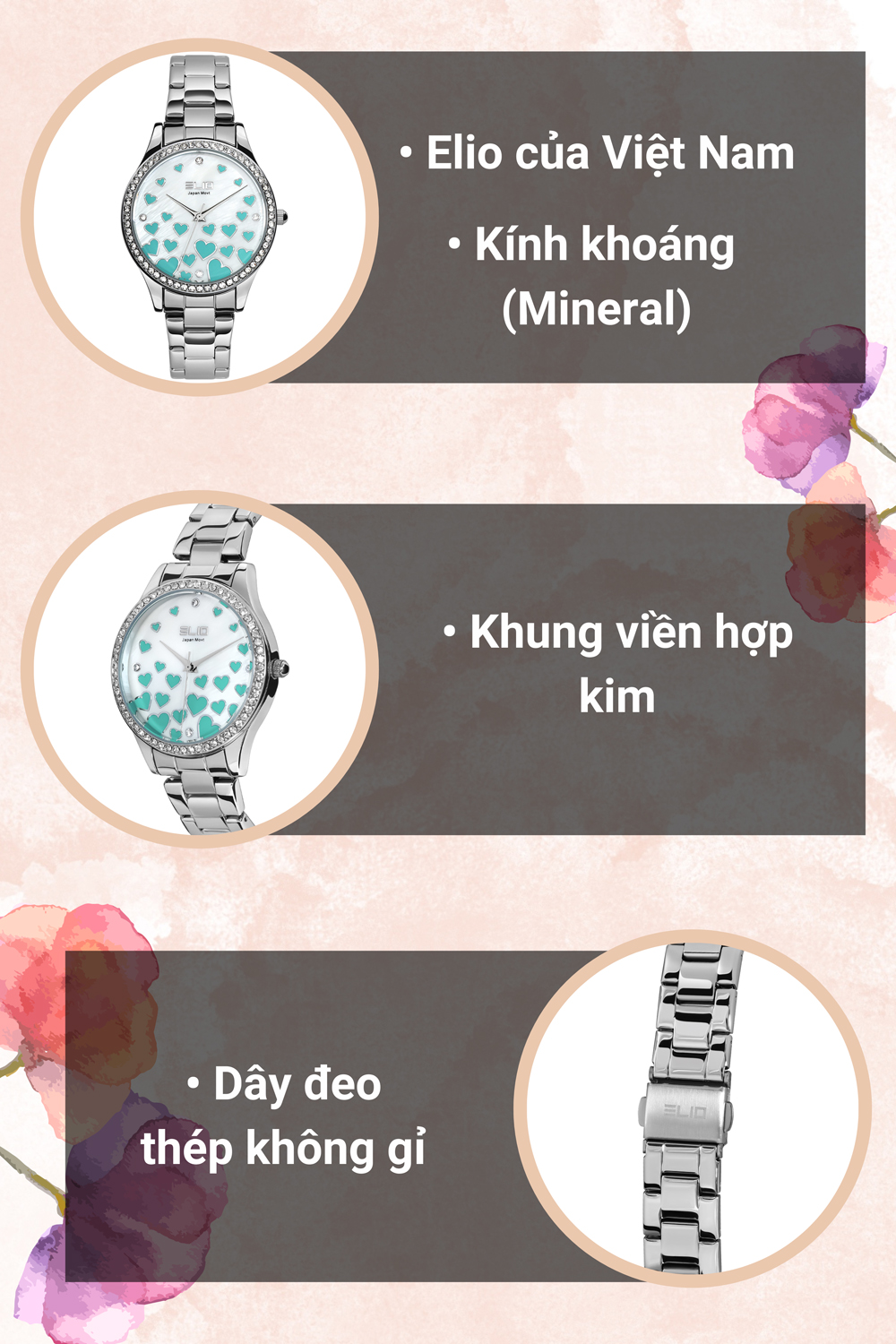 • Elio là một thương hiệu đồng hồ đến từ Việt Nam, và hiện đang được kinh doanh độc quyền tại Thế Giới Di Động. Hãng sở hữu mầu đồng hồ Elio 35 mm Nữ ES139-01 có thiết kế thanh lịch, với điểm nhấn là nhiều hình trái tim nổi bật trên mặt đồng hồ tạo nên phong cách trẻ trung và dễ thương cho người đeo.