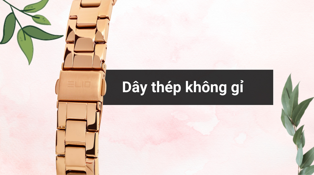 • Dây đeo của đồng hồ nữ này làm bằng thép không gỉ có độ bền cao, vật liệu này không bị ảnh hưởng bởi các tác nhân bên ngoài như mồ hôi giúp bạn đeo được mọi lúc mọi nơi. Ngoài ra, phần hợp kim được sử dụng để làm khung viền của đồng hồ có thể chịu va đập và chống trầy xước tốt. Hơn nữa, sản phẩm có thể được sử dụng trong thời gian dài, ít bị gỉ bởi tác động môi trường.