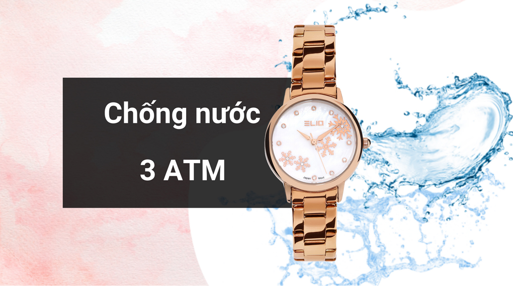 • Độ kháng nước của đồng hồ Elio này là 3 ATM, cho thấy sản phẩm có thể chịu được tiếp xúc ngắn hạn với nước, chẳng hạn như khi rửa tay hoặc khi đi mưa nhỏ. Tuy nhiên, bạn nữ lưu ý không đeo đồng hồ khi tắm, bơi hoặc lặn vì có thể gây hư hỏng sản phẩm.