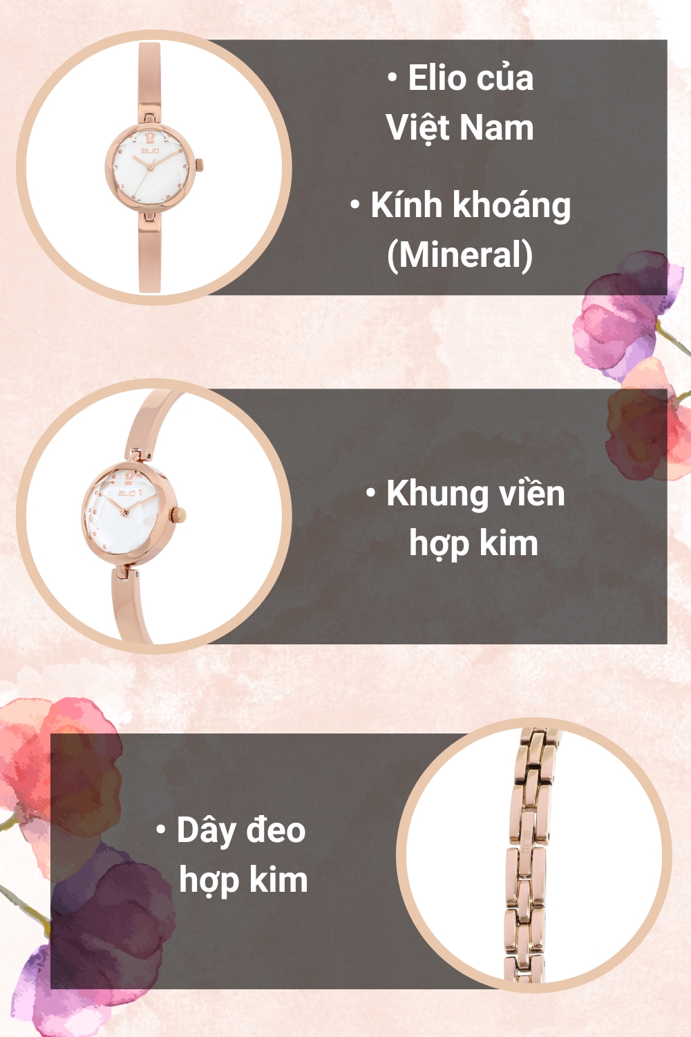 • Đồng hồ Elio có kích thước mặt 24 mm phù hợp với các bạn nữ kích thước cổ tay nhỏ hoặc vừa. Hơn nữa, hãng còn sử dụng chất liệu kính khoáng cho phần mặt đồng hồ, có thể chịu lực và chống trầy ở mức vừa phải. Đây còn là chất liệu có độ trong suốt cao, sẽ giúp bạn quan sát giờ một cách dễ dàng.