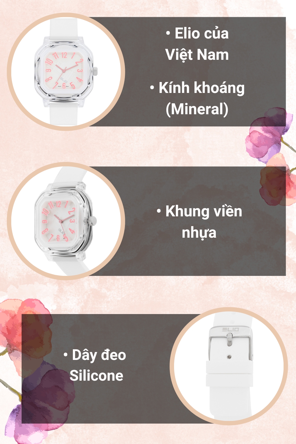 - Đồng hồ Elio với kiểu dáng, mẫu mã năng động, trẻ trung phù hợp với mọi lứa tuổi, đồng thời đồng hồ Elio còn mang vẻ đẹp sang trọng, lịch lãm. Đặc biệt đồng hồ Elio còn sử dụng bộ máy của Nhật Bản với chất lượng và độ bền cao.