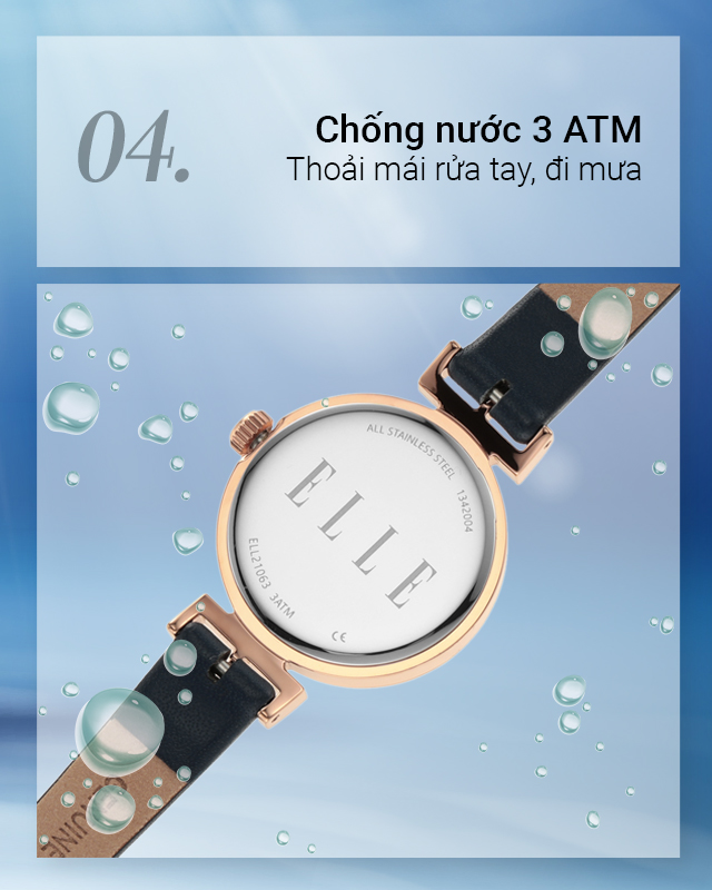 - Chiếc đồng hồ nữ này đeo được khi đi mưa, rửa tay với độ chống nước 3 ATM, không mang khi tắm hay bơi lội
