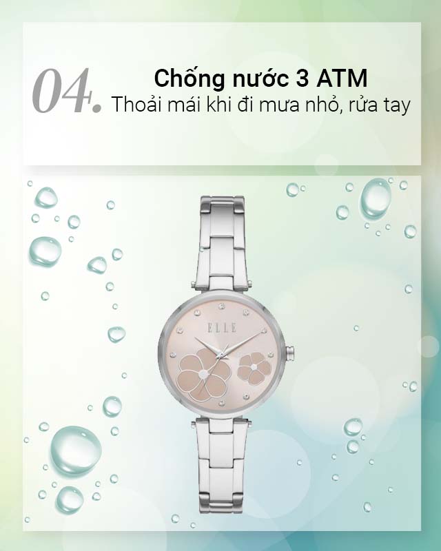 - Mẫu đồng hồ nữ này có chỉ số chống nước 3 ATM giúp bạn thoải mái đi mưa hay rửa tay, không nên mang đi tắm, bơi lội hoặc lặn