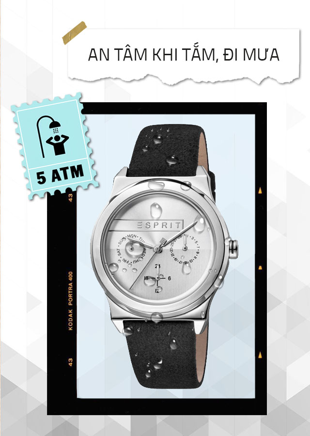 - Độ chống nước 5 ATM đảm bảo an toàn cho đồng hồ dù bạn đeo khi tắm, đi mưa hay rửa tay, không nên mang khi bơi, lặn