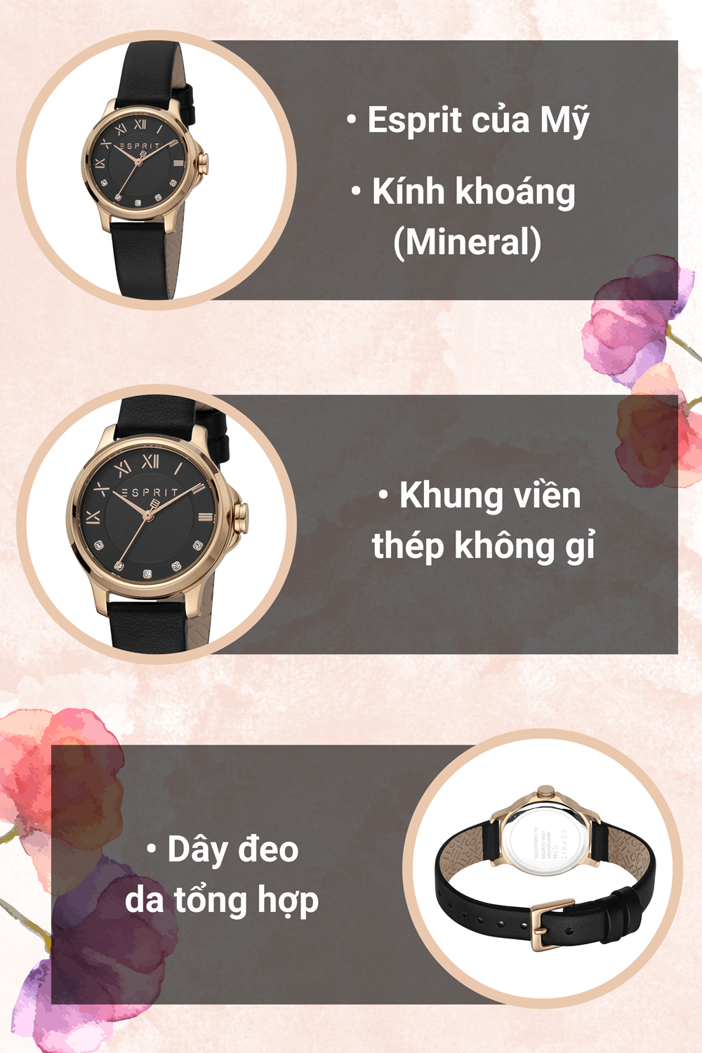 • Với đường kính 30 mm, mẫu đồng hồ Esprit này phù hợp với cổ tay trung bình đến vừa của phụ nữ, tạo nên vẻ đẹp hài hòa và cân đối. Thương hiệu Esprit đã sử dụng chất liệu kính khoáng chống va đập đáng tin cậy, bảo vệ mặt đồng hồ khỏi những tác động mạnh.