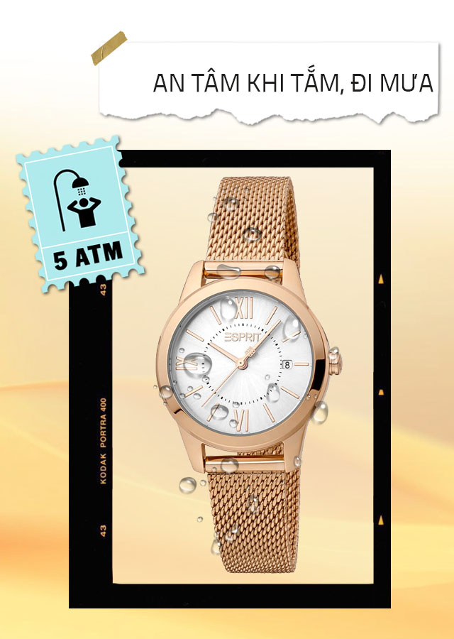 - Khả năng chống nước 5 ATM giúp bạn yên tâm đeo chiếc đồng hồ nữ này khi tắm, đi mưa, rửa tay, không nên mang khi bơi, lặn