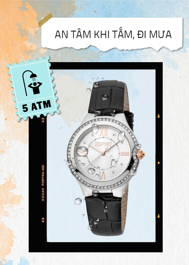 - Chống nước 5 ATM, không cần tháo đồng hồ ngay cả khi đi mưa, rửa tay, tắm nhưng không nên đeo khi lặn hoặc bơi lội