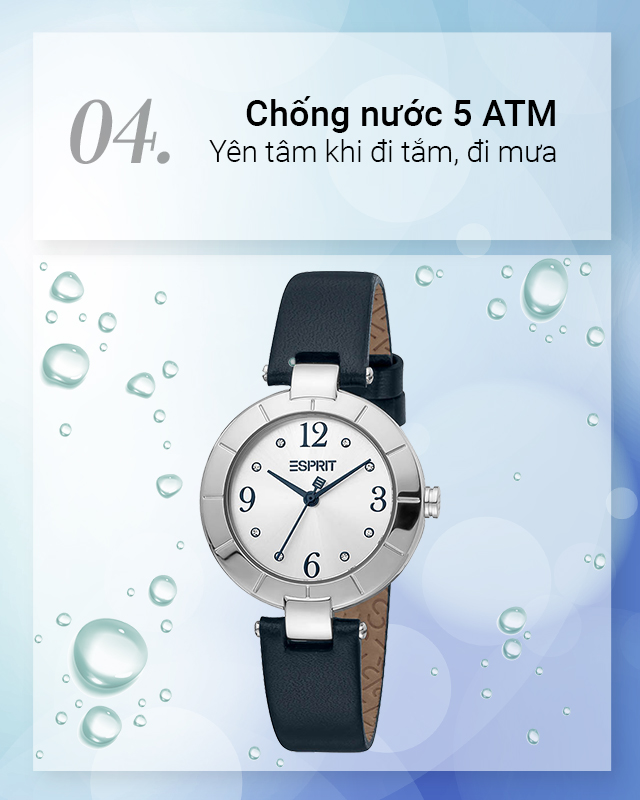 - Nhờ có chỉ số chống nước 5 ATM được tích hợp trên chiếc đồng hồ nữ này nên bạn có thể an tâm khi mang đi tắm và đi mưa. Tuy nhiên, bạn không nên sử dụng khi bơi lội hoặc lặn