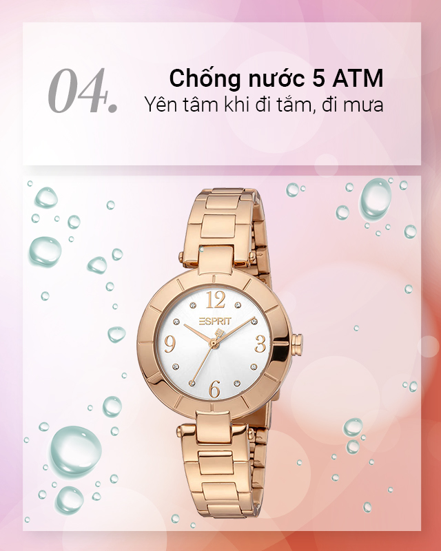 - Nhờ có hệ số chống nước 5 ATM, bạn có thể yên tâm đeo chiếc đồng hồ nữ này khi tắm và đi mưa, lưu ý không nên sử dụng khi bơi hoặc lặn