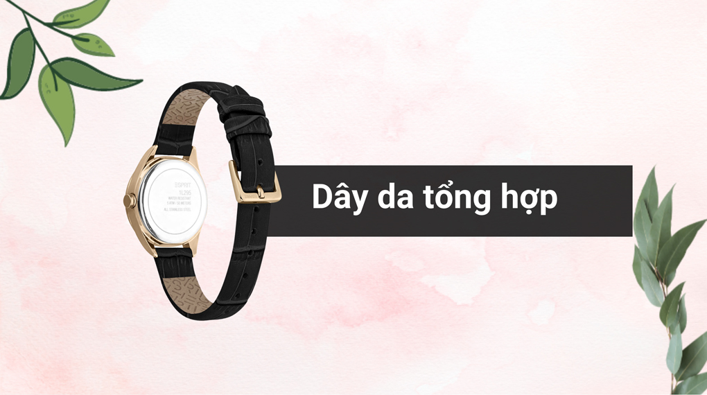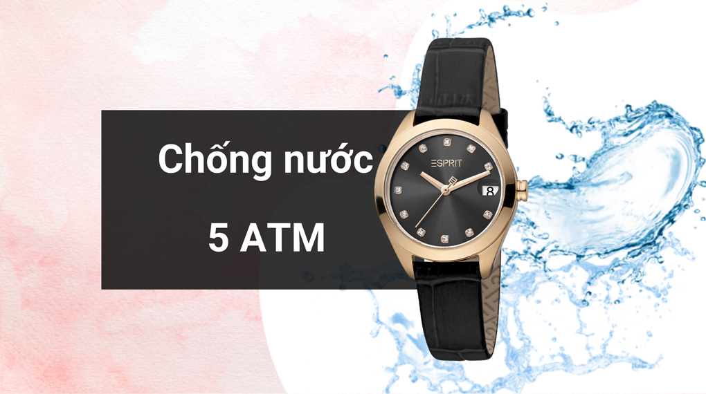 • Đồng hồ Esprit này có khả năng chịu nước đạt đến 5 ATM, giúp bạn thoải mái đeo trong các hoạt động như rửa tay hay đi tắm. Tuy nhiên, không nên đeo khi đi bơi hoặc lặn.