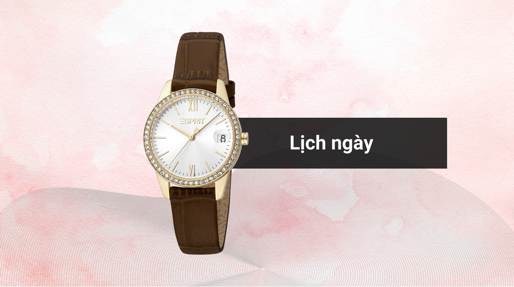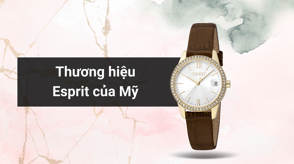 • Mẫu thiết kế của nhà Esprit này có kiểu dáng bên ngoài vô cùng nổi bật với thiết kế đính đá khung viền toát lên thần thái sang trọng cho người đeo. Ngoài ra, trên mặt đồng hồ này không quên bổ sung hình logo - biểu tượng vô cùng nổi tiếng của thương hiệu nằm ngay tại điểm trung tâm được in nổi vô cùng bắt mắt thể hiện sự cá tính và độc đáo cho thương hiệu.