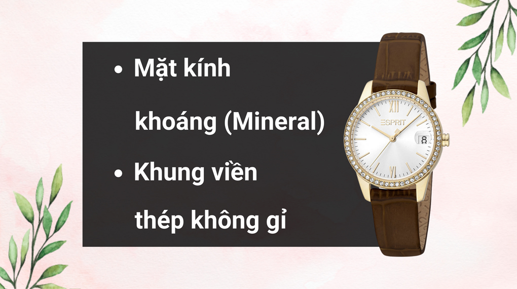 • Ngoài ra, khung viền đồng hồ Esprit được làm từ thép không gỉ, vừa giúp nâng tầm sang trọng của mẫu mã lại vừa bền bỉ, hạn chế ăn mòn trước tác động từ môi trường. Phần dây đeo kiểu dáng độc đáo của mẫu đồng hồ nữ được làm từ da tổng hợp. Chất liệu này sẽ là lựa chọn lý tưởng thiết kế ôm tay, dễ dàng điều chỉnh kích thước linh hoạt.
