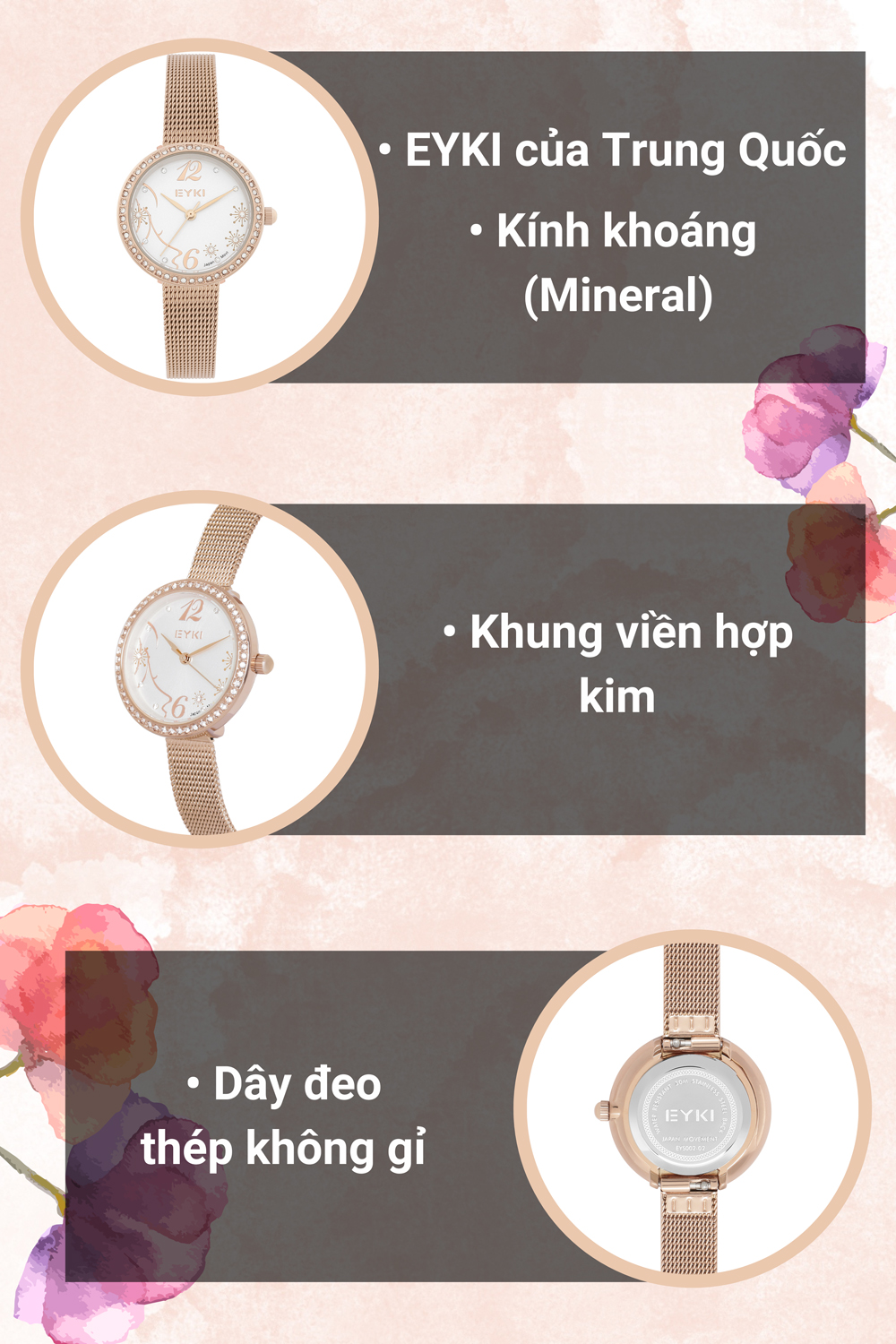 - Đồng hồ Eyki đa dạng mẫu mã, đi đôi với các kiểu dáng đơn giản, trẻ trung phù hợp với mọi lứa tuổi, đồng thời đồng hồ Eyki còn mang vẻ đẹp thanh lịch, nhẹ nhàng và sang trọng.
