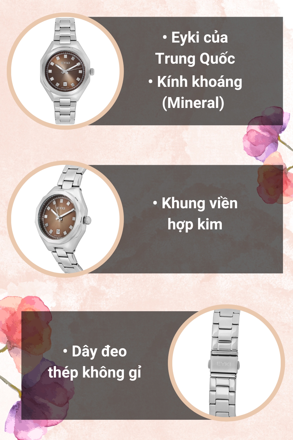 - Đồng hồ Eyki đa dạng mẫu mã, đi đôi với các kiểu dáng đơn giản, trẻ trung phù hợp với mọi lứa tuổi, đồng thời đồng hồ Eyki còn mang vẻ đẹp thanh lịch, nhẹ nhàng và sang trọng.