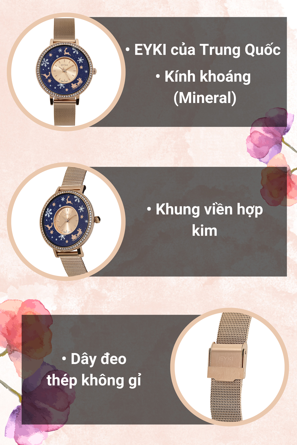 - Đồng hồ Eyki đa dạng mẫu mã, đi đôi với các kiểu dáng đơn giản, trẻ trung phù hợp với mọi lứa tuổi, đồng thời đồng hồ Eyki còn mang vẻ đẹp thanh lịch, nhẹ nhàng và sang trọng.