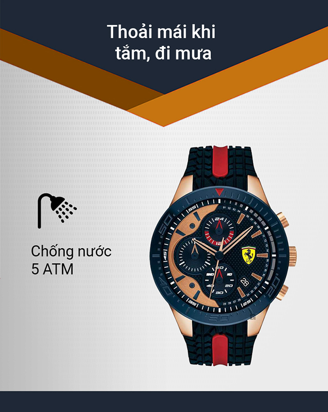 - Hệ số chống nước 5 ATM: Thoải mái đeo đồng hồ khi tắm, đi mưa mà không lo hư hỏng do vào nước, không mang khi bơi, lặn