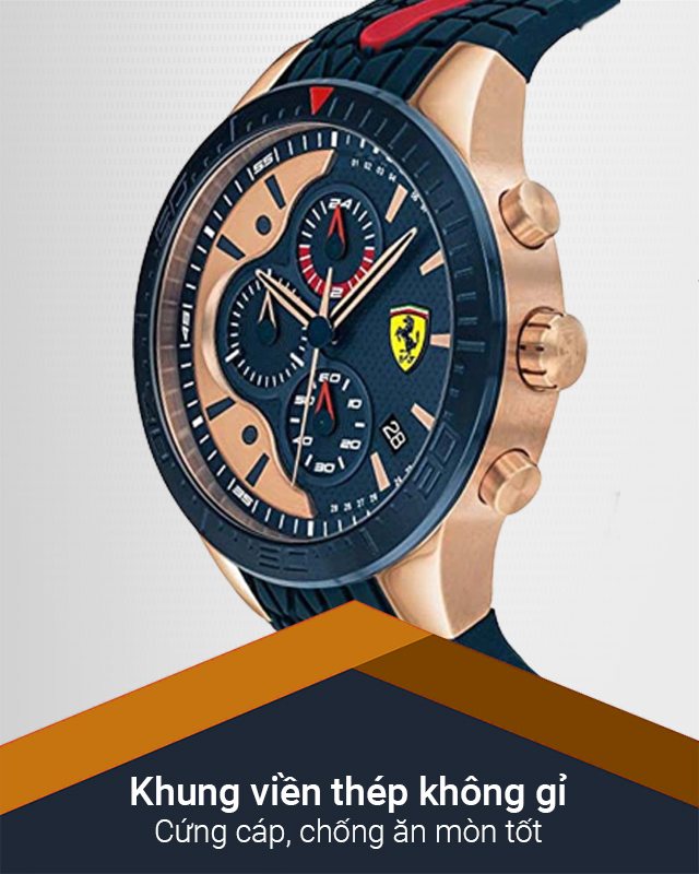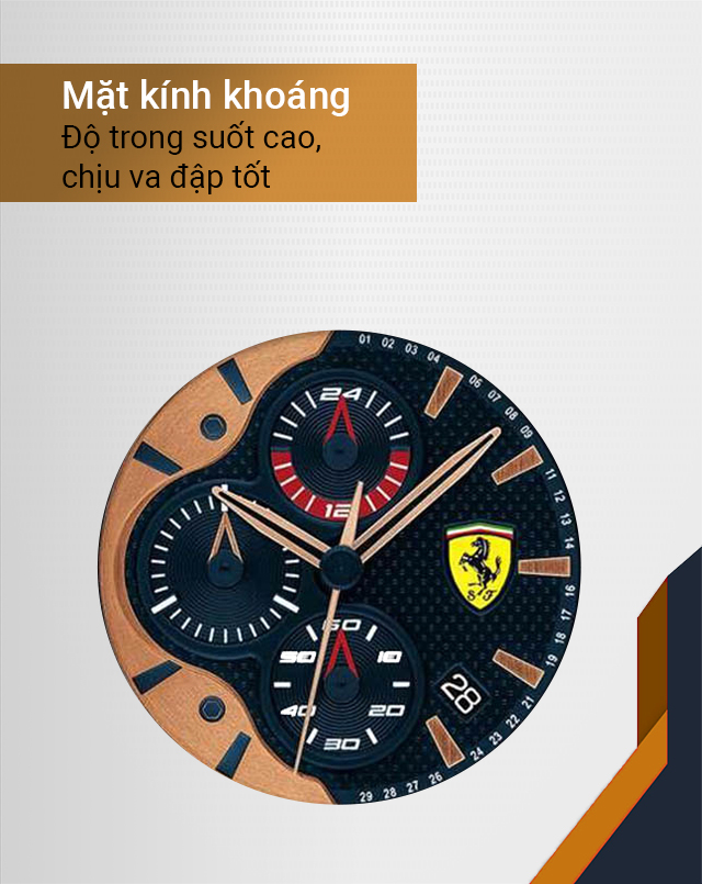 - Thiết kế ấn tượng, mạnh mẽ, đẳng cấp, lấy cảm hứng từ những siêu xe của họ, đồng hồ Ferrari là bộ sưu tập không thể thiếu đối với những bạn trẻ có niềm đam mê về tốc độ. Tất cả các quá trình làm nên chiếc đồng hồ từ thiết kế có đến lắp ráp đều được hãng theo dõi gắt gao để mang đến người dùng một sản phẩm chỉnh chu và hoàn thiện nhất đến từng chi tiết.