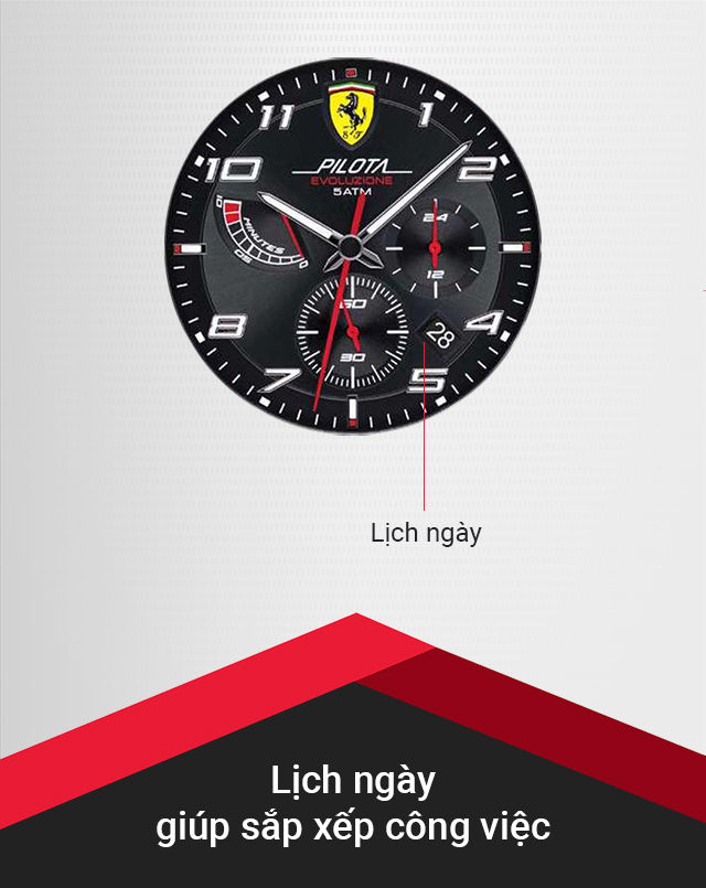 - Trang bị thêm tiện ích lịch ngày, bấm giờ và đồng hồ 24h ngay trên mặt đồng hồ để người dùng quan sát nhanh chóng, thuận tiện